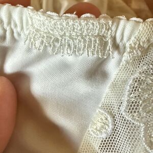 Clean! No snags. I see a few very small and faint blue dots on the underside. This may be bleed over from another piece of clothing. See the last picture. I've used pink tissue paper to better show that pattern of the lace.