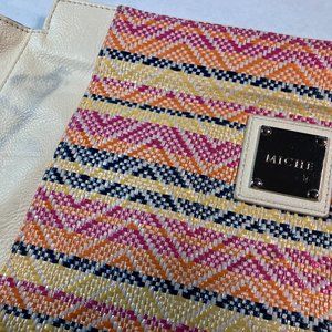 This is a fun woven and faux leather cream prima size Miche shell called Pamela. The metal details are silver. There is some discoloring on the front of the back of the shell, possibly from bleeding of another shell during storage; see pictures, unsure if it could be removed. Perfect for running errands or a night out.