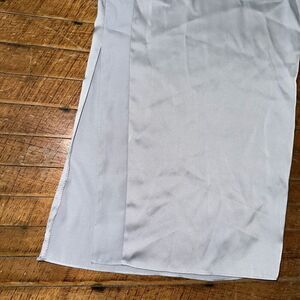 Prima Tornai for Azazie silvery gray, wide leg, slit hem, silky, high waist dress pants. Brand new. Approximately 15 inches across the waist, 13 inch rise, and 29 inch inseam. 35.5 inch hips. From a pet and smoke free house.