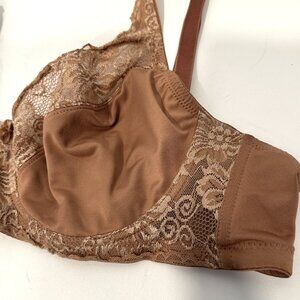 Women's Size 40DD Prima Valentina Underwire Bra ~ Brown with Floral Lace Trim ~ Soft Stretchy Cup with No Padding ~ Machine Washable Nylon and Spandex Fabric ~ Back Closure ~ Adjustable Straps ~ Very Good Gentle Pre-Owned Condition from a Smoke-Free Home