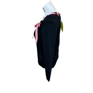 Prima Bella NWT black with pink and green ribbon 3/4 sleeve sweater size S. Style 635104. 55% rayon 45% nylon. Length 21” Chest 16”.