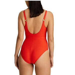 The seventies-style swimsuit has been given a trendy makeover with soft, structured fabric without underwires. The elegant shoulder straps and silver rings complete the look! Red Pepper is a fiery shade of coral red perfect for the summer and for retro swimwear.