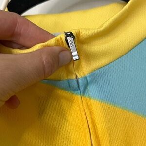NWT Full zip cycling jersey. Colors are vibrant and eye catching, helpful for visibility. High low hem, helps cover the bum while riding. YKK zipper is quality. Lightweight, three elastic band topped pockets on the back to hold your essentials.