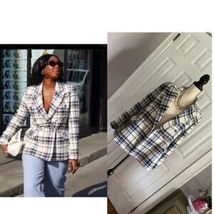 Tartan Bouclé Structured Blazer has a similar texture to tweed with a large white and navy check design.