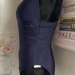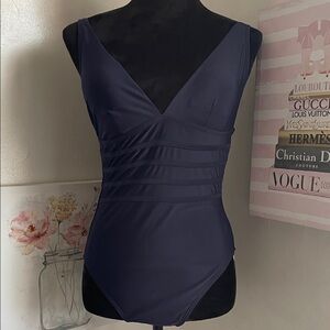 Elegant navy one-piece swimsuit. Features a flattering V-neckline. Perfect for beach or pool.