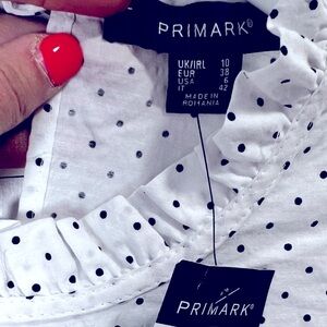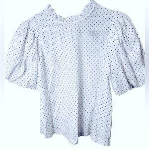 Fresh + feminine Primark blouse in crisp white with navy polka dots. Features a soft ruffle/mock neckline and on-trend puff sleeves for an easy, polished look. New with tags. U.S. size 6.