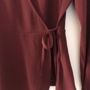 Long sleeve maroon wrap top. Ties in a bow on the side. Inside has a button to wrap with. Has little buttons on the cuffs
