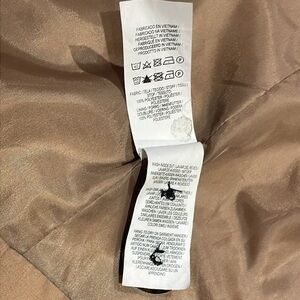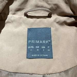 Camel color Primark size 8 double breasted coat. Lined, front buttons and pockets, flip lapel collar, buttons at wrist. Belt loops but no belt is included. Extra buttons on tag. Coat and lining 100% polyester.
