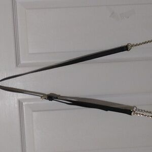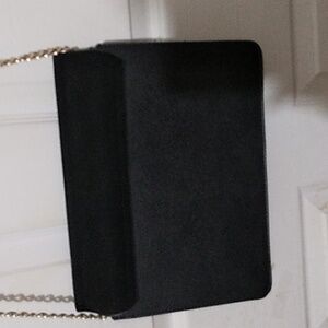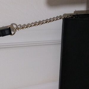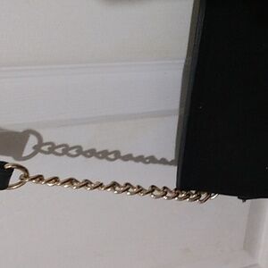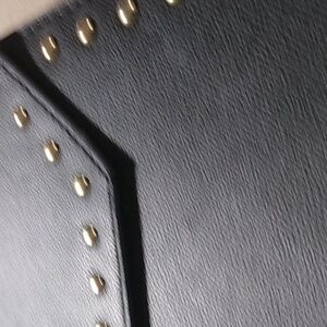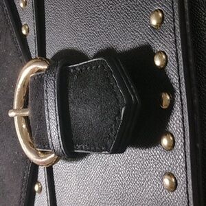 Primark womans cross-over purse made of faux leather and suede. It has buckle snap closure, silver stud accents in front,and several compartments inside. Also has chain on lower part of strap. NEVER USED!