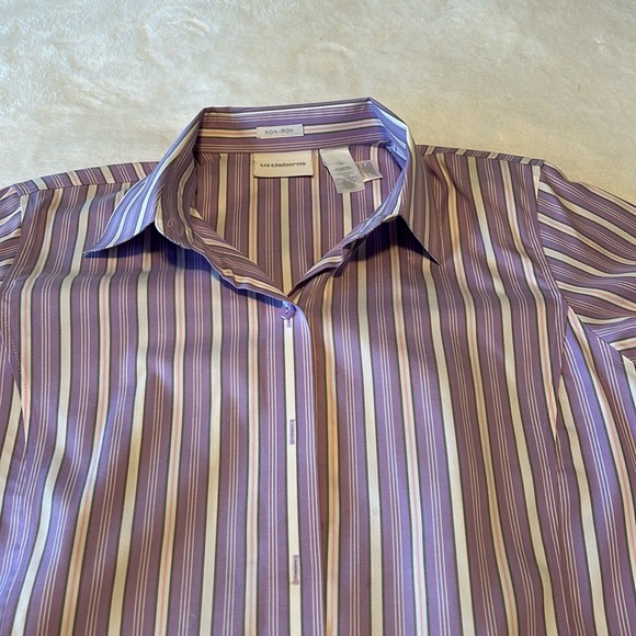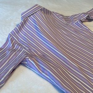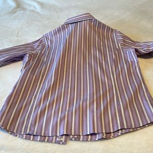 Purple, pink, gray and white striped blouse made of no iron material. Great for casual. Wear with jeans or wear it to the office for a nice polished look.
