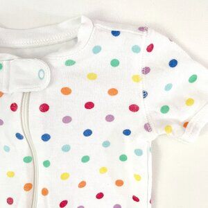 Primary baby onesie (white with multi color polka dots). Shorts and short sleeves with zipper front closure.