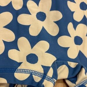 Primary, size 2. Great for toddler. Full arm coverage. Button snaps for easy swim diaper change. Pilling a tiny bit on the booty. Zip closure. Adorable blue floral swimwear for kids, perfect for fun in the sun. Comfortable and stylish design.