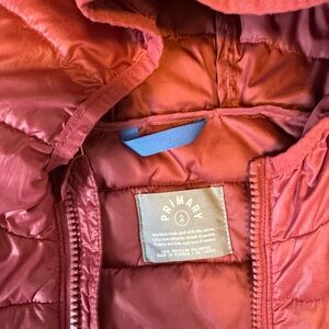 Lightweight puffer jacket with hood and pockets. Color: raspberry. Durable and comfortable, not too bulky for car seats. Slight wear on sleeves (as shown).