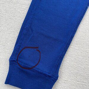 Primary organic long-sleeve PJ top and pants. Cobalt blue in color. Size 4-5. GUC for fading at knees and for brown (marker?) stains on back of one arm and on left front of pants leg. See pictures. No holes. Washed inside-out on gentle and hung to dry. Non-smoking, dog-friendly, low-scent home.