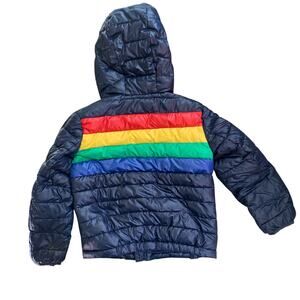 Navy puffer coat with rainbow striped, hood, full front zip and pockets