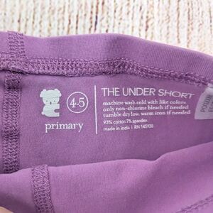 Primary Under Shorts Bundle in size 4-5. A building block of a kid's closet, known for its softness, quality, and colors you can't find anywhere else. These are the best for under dresses! My girls love them! Listing includes 3 pairs: 1 in Lavender, 1 in Grape, and 1 in Cobalt. Great condition! No stains, holes, rips or pulls. Only washed in Free & Clear detergent. Smoke free pet free home.