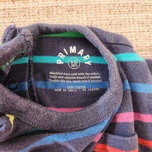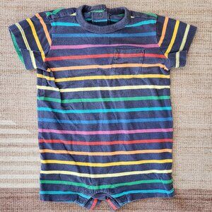 Navy blue with rainbow stripes! Cute little front chest pocket. Buttons on the back of the collar help with dressing and buttons at the crotch make changing easy. Love this piece, so playful and cute!