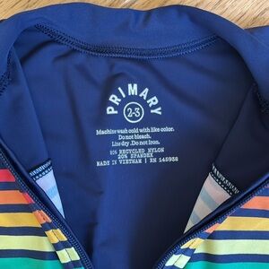 Primary swim shirt rashguard in size 2-3. Rainbow stripe. Zip for easy over the head on and off.