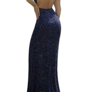 Step into elegance with the Primavera Couture gown, a masterpiece in blue adorned with shimmering sequins. This sleeveless dress features a sophisticated spaghetti strap and a daring V-neckline, perfect for making a statement at prom or a night out. The bodycon silhouette, enhanced by a dramatic side slit, ensures a captivating and glamorous look. Experience the allure of this exquisite dress, designed to dazzle and impress.