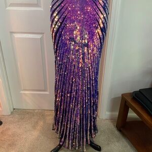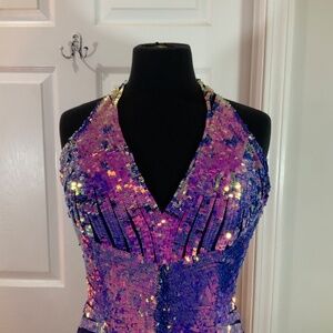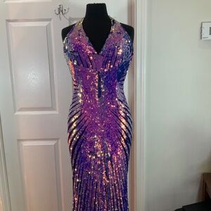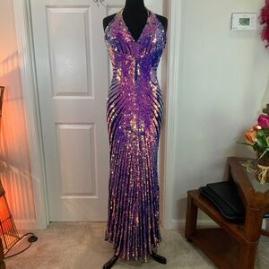 Primavera Couture Sequin Halter Purple Pink Open Back Mermaid Gown Size 10