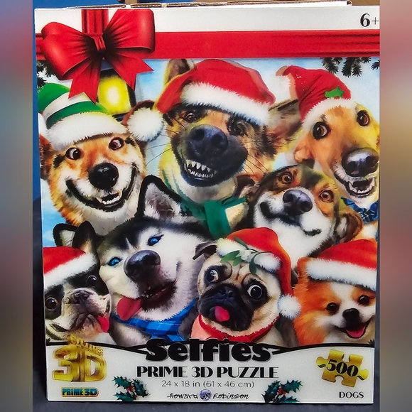 NIB Selfies Prime 3D Christmas Dogs is a 500 piece jigsaw puzzle by the artist Howard Robinson that features a variety of dogs dressed in festive holiday hats and outfits.