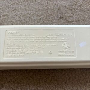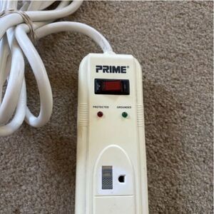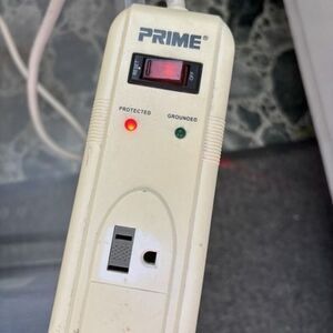 Prime Surge Protector Power Strip. Protects electronic devices from power surges and voltage spikes. It features a red protected indicator light and a green grounded indicator light. Has an on/off switch and in/out ports for phone or network lines. Color has faded to an off white. See photos. Unit works and is I. Good condition.