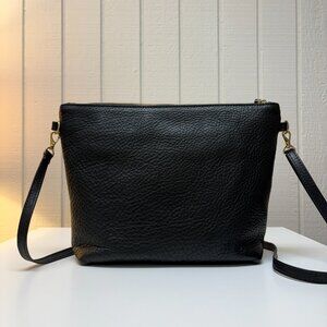 Like new, small hobo that can be worn as a shoulder or crossbody bag. Made in Portland, Oregon, of beautifully textured leather. No significant wear - carried fewer than 10 times. Measures approximately 12" wide, 10" high, 2" deep. Removable strap adjustable between 27 and 50". Solid brass hardware. Zip closure and interior zip pocket. Lined.