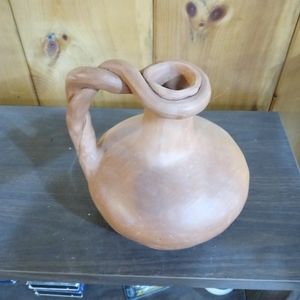 Vintage primitive red clay pitcher featuring a braided handle. Sturdy and well made. Perfect condition.