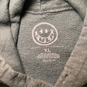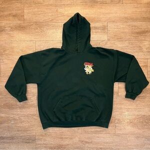 Green hoodie featuring a vibrant graphic print on the back. Bold colors include red, yellow, and green.