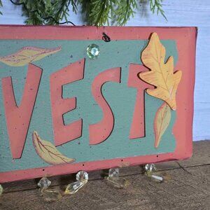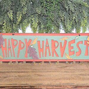 Orange and green "Happy Harvest" wall hanging sign featuring maple leaves, green jewels, and clear dangling jewels. It has some minor we are to the finish at the bottom edge and some typical light surface scuffs and scratches. It measures 8" high with the jewels but not the wire to hang it, and 23.75" wide.