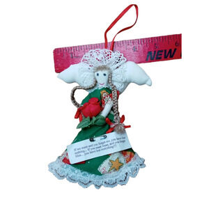 This primitive Christmas angel cloth doll ornament doubles as a tree topper, bringing rustic charm and heartfelt faith into your holiday decor. She features braided pigtails with red bows, a lace head covering, and a festive red and green dress trimmed in lace. The angel holds a red rosebud and wears a beaded necklace, while carrying a touching Christian message: “If we meet and you forget me, you have lost nothing… If you meet Jesus, and forget Him, you have lost everything.” A unique piece for spreading inspiration, gospel spirit, and country charm to your Christmas celebrations.