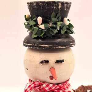 Primitive Snowman Candle Holder Wooden Handcrafted Folk Art Christmas Decor Black Hat. Does NOT include candle. Snowman smiles, candlelight glow—holiday magic in one adorable piece! A charming handcrafted wooden snowman candle holder featuring a rustic black hat and festive berry garland. This folk art-inspired piece brings warmth to any holiday setting, perfect for mantel displays or cozy winter decor. The sturdy wood construction ensures durability, while the intricate details add a nostalgic touch. A delightful seasonal accent for collectors and holiday enthusiasts alike.