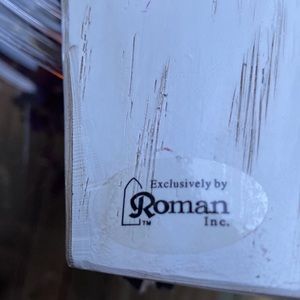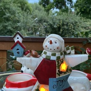 This delightful snowman is manufactured by Roman Inc. His arms are full of birds and a banner spells out joy. Two stars and the moon are lit via batteries. It does need a fresh set of batteries, but currently operates. I believe he was manufactured in the 1980s or 90s. he stands 8 1/2 inches tall and 7 1/2 inches wide.