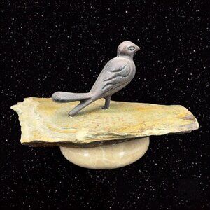 Primitive Style Sculpture Cast Iron Bird On Stone Base Carved Marble Bottom VTG