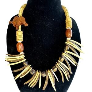 Primitive Wood Carved Beaded Bohemian Elephant African Safari Animal Necklace