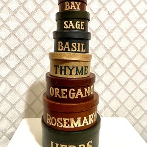 Seven herb themed primitive folk art stackable/nesting boxes. Various colors with all writing in a cream tone. 14.25” tall when stacked x 6” wide at the base.