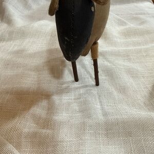 Stuffed, cotton body stuck legs with felt at top of the legs and tail. ALS the face is painted black white paint for eyes. Could make a cute piece for home decor anywhere or maybe even a toy for a child.