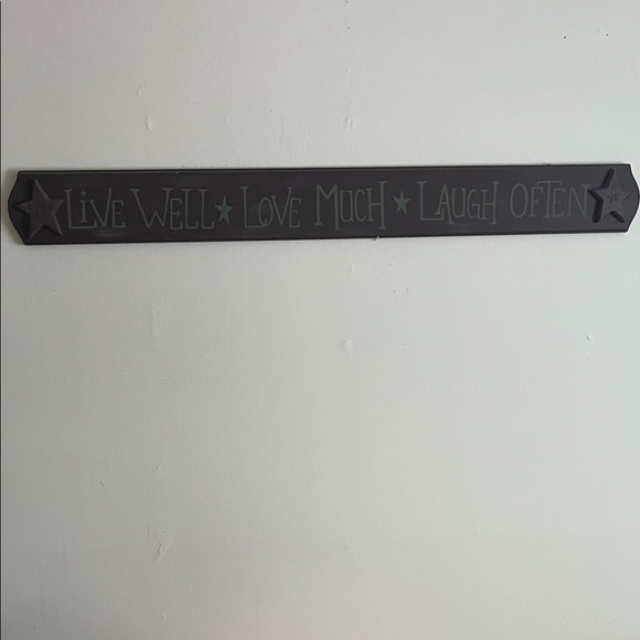 Black wall sign with 'Live Well, Love Much, Laugh Often' text. Perfect for home decor.