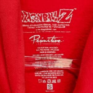 Primitive x Dragon Ball Z hoodie in size small. This red pullover style hoodie features a drawstring closure, but please note that the drawstring is missing. It is perfect for fans of the popular anime series.