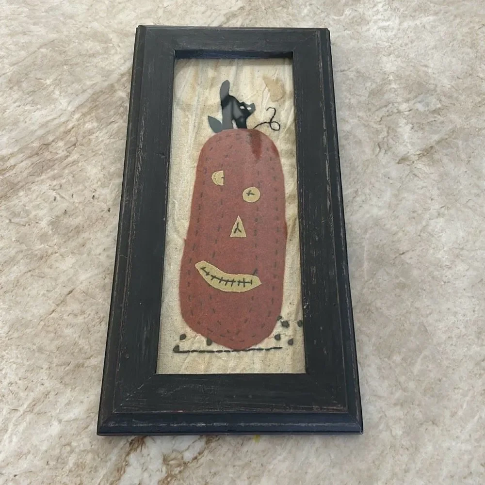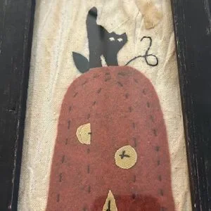 Cute framed felt jack-o’-lantern stitched on a tea stain cloth. Cute black cat sitting on top of the pumpkin approximately 7 inches wide by 15 inches tall. Framed under glass. Ready to hang.