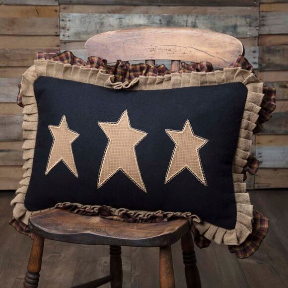 The 14x22 Primitive Stars Pillow stands out from among the rest. The primitive mustard plaid primitive stars are appliques on a black felt base and stitched in tan whip stitching. The pillow is trimmed with a double ruffle in natural burlap and burgundy, tan, and black check. Reverses to burgundy, tan, and black check with 2 tie closures.