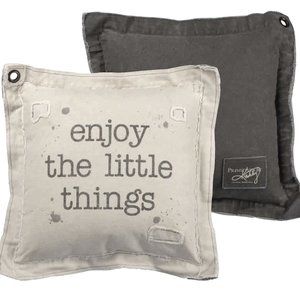 Primitives by Kathy Enjoy the Little Things In Life decorative pillow a cotton and polyester pillow featuring a distressed sentiment with fringe accents. Complements well with coordinating pieces in collection or existing decor.