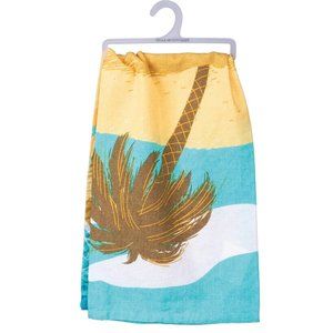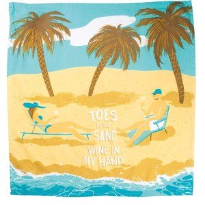 Made of full color cotton dish towel featuring a "Toes In The Sand - Wine In My Hand" sentiment with characters on the beach and palm trees designs
