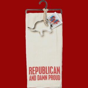 A colored box sign style cotton dish towel featuring a "Republican And Damn Proud" sentiment. Includes attached elephant shaped cookie cutter and hangtag featuring full design. Towel features a cotton is machine washable.