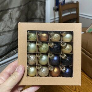 Set includes 16 ornaments with a mix of solid and glitter designs. Our Neutral glass ornament set is ready to hang via the included top hangers.