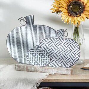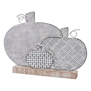 A metal and wood slat sitter from our Fall & Harvest Collection displaying pumpkins, varying in size and design on wood base. Pumpkins slat sitter features metal art using dark metal with white detailing to accent three unique embossed patterns and wood base. Free-stands alone on flat surface.