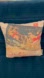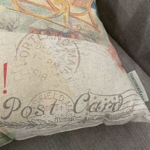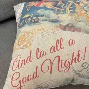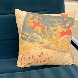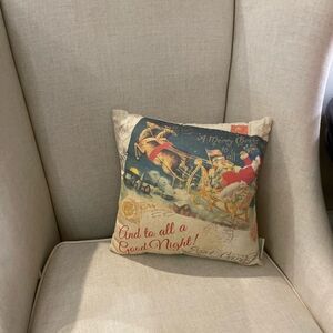 New with tags Christmas pillow featuring Santa riding a sled with a jolly smile. He holds an American flag and mistletoe.