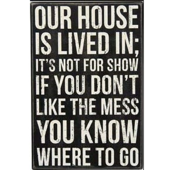 Primitives by Kathy Box Sign says: OUR HOUSE IS LIVED IN; IT'S NOT FOR SHOW IF YOU DON'T LIKE THE MESS YOU KNOW WHERE TO GO. Primitives by Kathy box signs are made of wood with smooth sanded edges and deep sides which allow them to sit freely on a flat surface or hang on the wall. The slightly distressed letter design gives them a vintage look. Primitives by Kathy is a leading producer of high quality decorative box signs and home deco