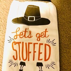 Kitchen Thanksgiving towel from Primitives by Kathy. Brand new with tags and celebrates Thanksgiving. The towel reads “Let’s Get Stuffed” and features a Pilgrim hat and legs graphic.