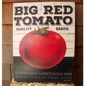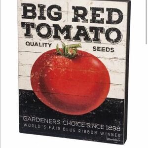New with tags Primitives by Kathy big red tomato sign for kitchen or dining room decor. Distressed paper graphics are applied over wood. The sign reads, "Gardner's Choice Big Red Tomato Big Red Tomato quality seeds World Fair Blue Ribbon."